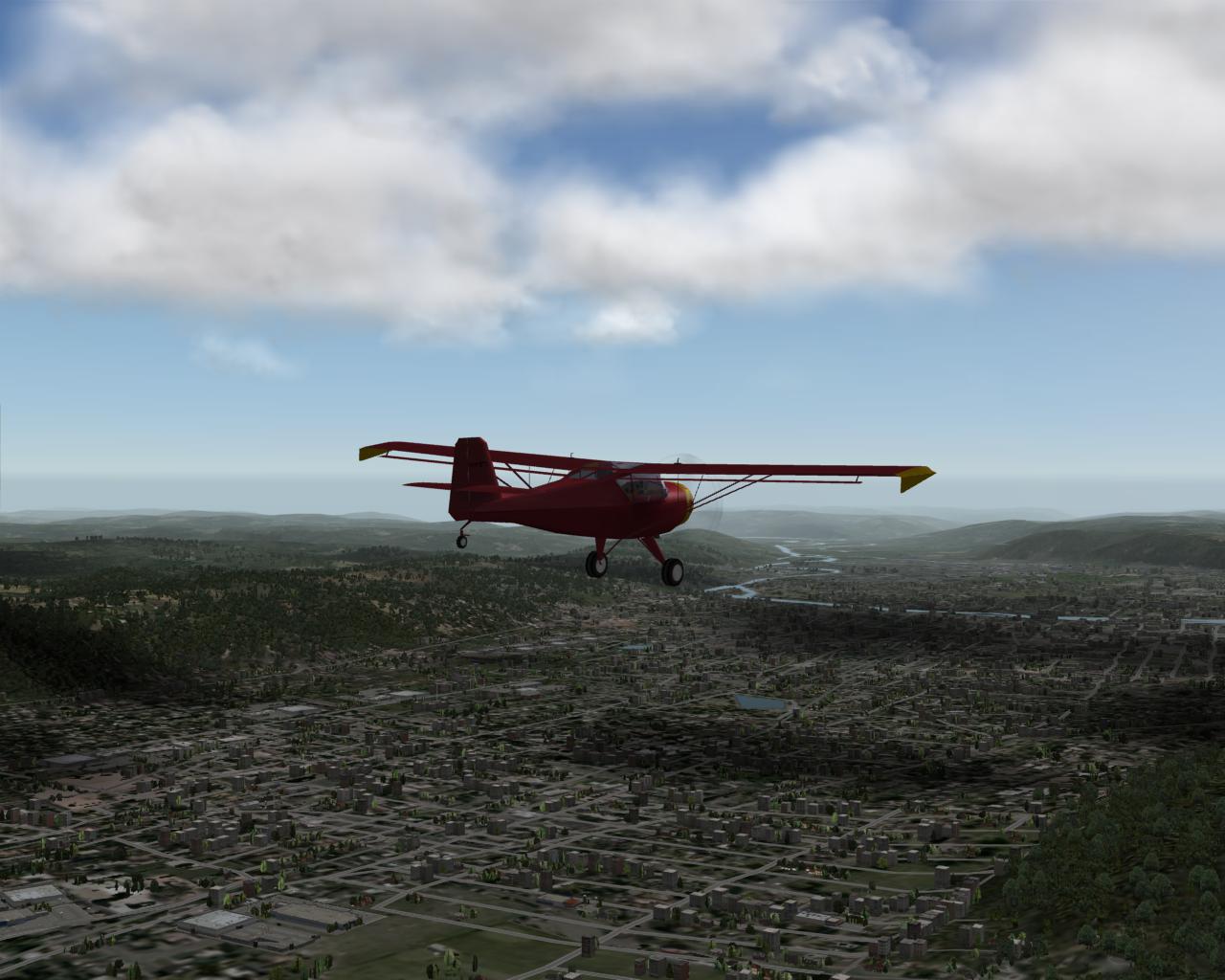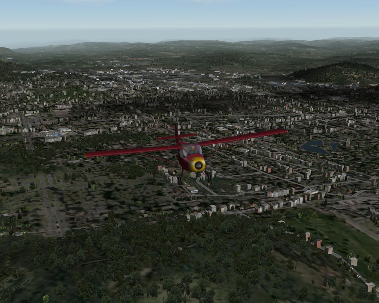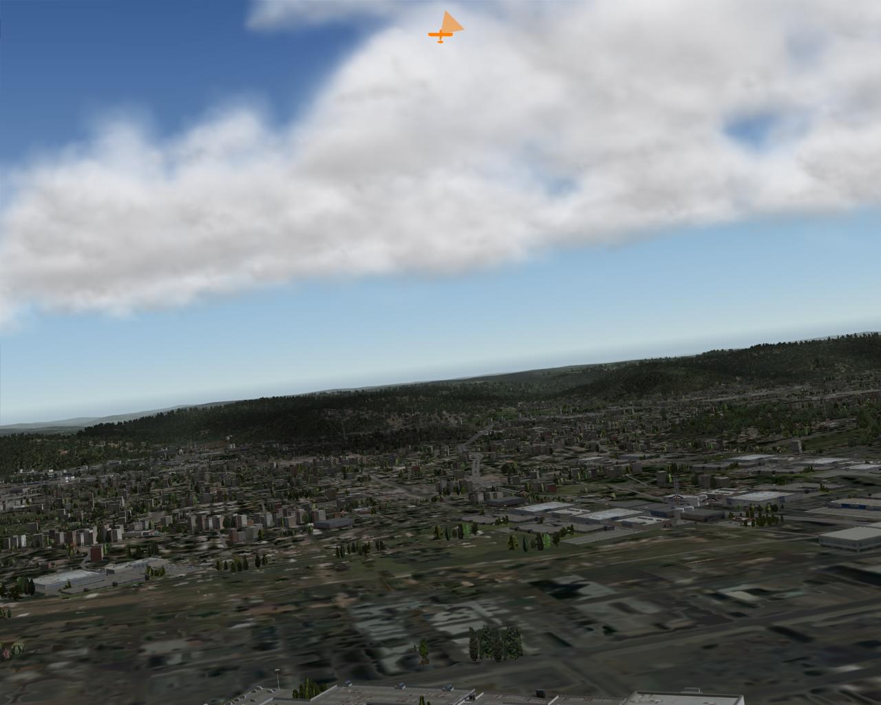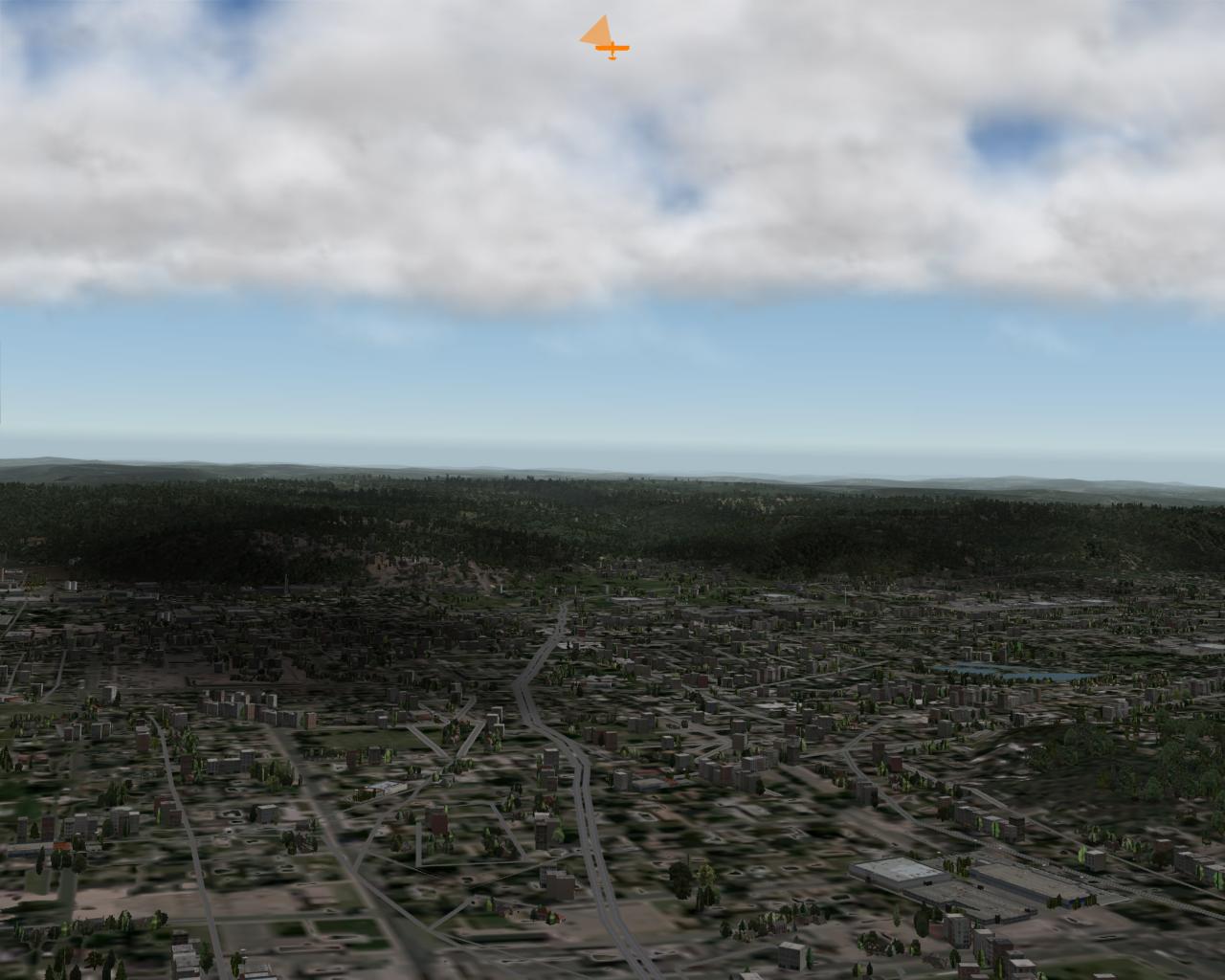 Edit: here are some pictures I took of our local area. Elmira, NY specifically. The buildings are generic, but it uses a real road map database, so all the roads and railroads you see are real. Notice the numbers of trees, this adds a lot of realism over just flat terrain in my opinion. Also notice the cloud shadows over th hills, really nice effect.