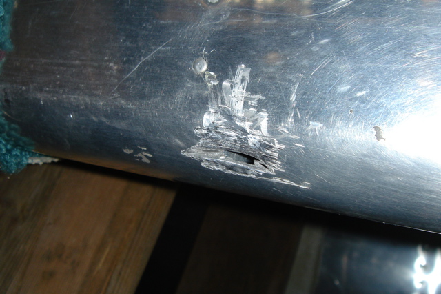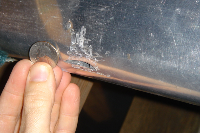 Unfortunately, the crap that passes for roads in parts of this country bounced things around enough that one of our wings, held vertically in a cradle, shifted far enough that it contacted the fuselage step. The result was a small hole, as illustrated in the attached photos. More unfortunately, this is the fuel tank.